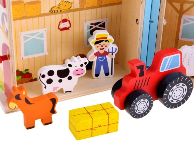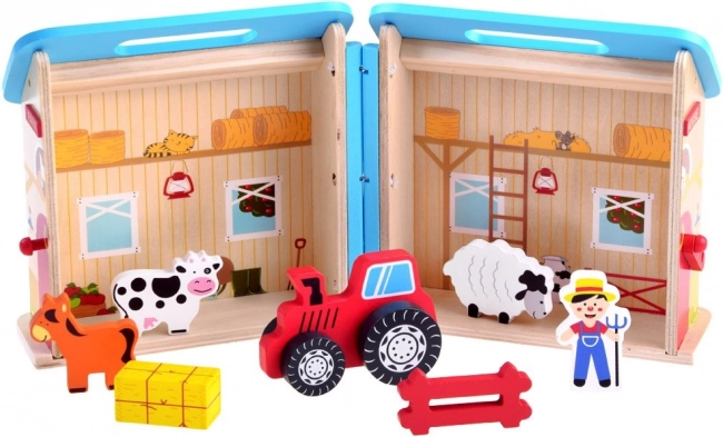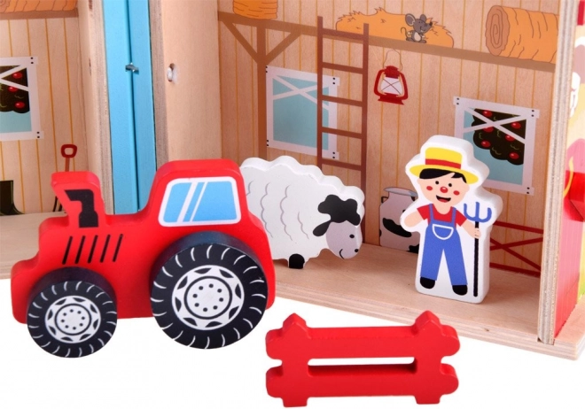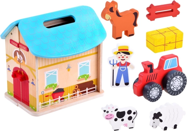 Zawiera figurki zwierząt, takie jak krowa, baran i koń. Wszystko jest wykonane z trwałego drewna.