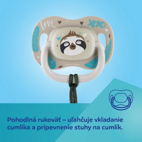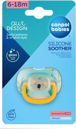 Stylowy smoczek Canpol babies Exotic Animals z motywem koali dla dzieci 6–18 miesięcy zapewnia spokój i komfort. Ma symetryczny silikonowy ustnik bez smaku i zapachu, wentylowaną tarczkę delikatną dla skóry, praktyczny uchwyt do łatwego przypięcia oraz świecący środek ułatwiający znalezienie w ciemności. Bez BPA, solidny i odporny na odkształcenia.