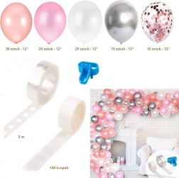 Zestaw balonów zawiera taśmę z oczkami do wykonania girlandy.