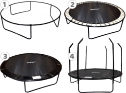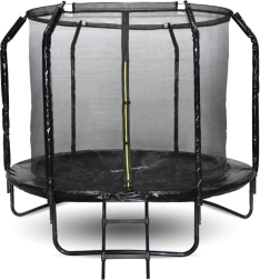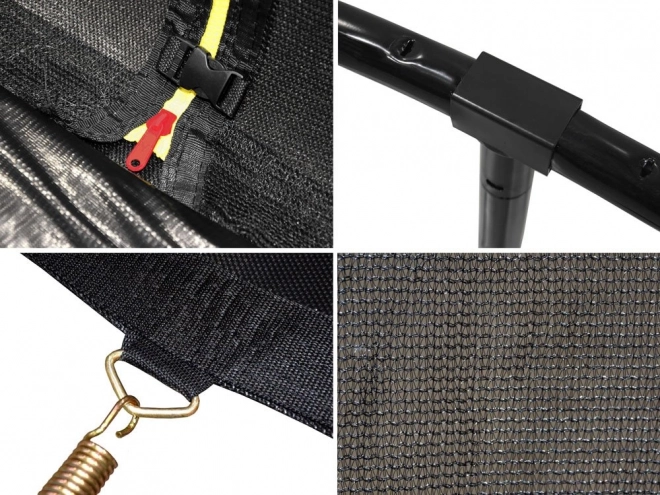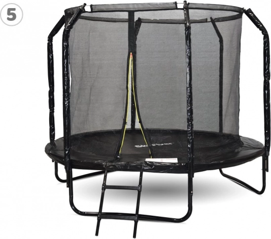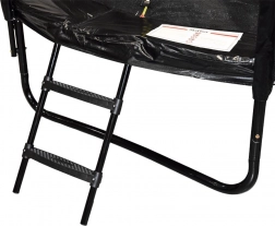 Powierzchnia do skakania z polipropylenu JUMPING MAT jest przeszyta 8 wytrzymałymi szwami, co zwiększa odporność na obciążenia. Profilowane metalowe słupki są osłonięte miękką pianką ochronną, a wejście do trampoliny ma podwójne zabezpieczenie (zamek + klamra). Dwustopniowa drabinka ułatwia wejście.