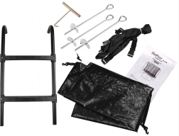 Drabinka, kotwy z pasami, wodoodporny pokrowiec przeciwdeszczowy oraz narzędzie do naciągania sprężyn – wszystko do łatwego montażu i bezpiecznego użytkowania.