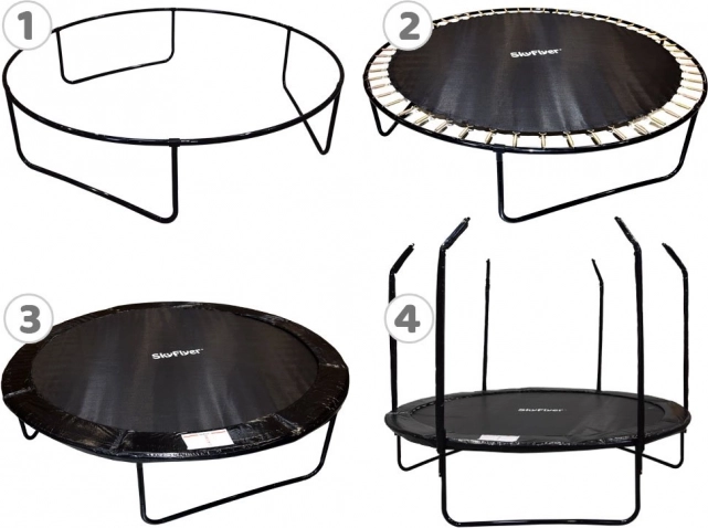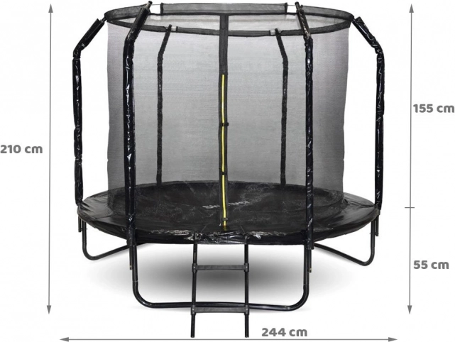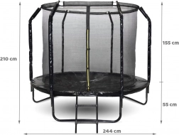 Trampolina SKYFLYER o średnicy 244 cm to świetny wybór dla rodzin, które chcą wspierać aktywność dzieci i dorosłych. Solidna konstrukcja z nogami w kształcie U, mocne sprężyny oraz gęsta siatka ochronna ze stabilnym wzmocnieniem obwodowym zapewniają maksymalne bezpieczeństwo i stabilność podczas skakania.