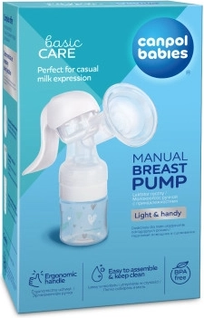 Ręczny laktator Basic z prostą obsługą i pielęgnacją. Mała liczba elementów ułatwia czyszczenie. Specjalnie wyprofilowana dźwignia sprawia, że odciąganie jest bardzo wygodne i nie wymaga dużej siły. Praktyczna podstawa zapewnia stabilne ustawienie laktatora. Wyprofilowany lejek idealnie dopasowuje się do kształtu piersi. Silikonowa wkładka masująca delikatnie masuje pierś i dzięki odciąganiu nadmiaru mleka pomaga zapobiegać stanom zapalnym. Jest kompatybilny z innymi akcesoriami do przechowywania mleka – możesz odciągać mleko bezpośrednio do klasycznych butelek oraz butelek z szeroką szyjką Canpol babies. Ręczny laktator do mleka mamy jest dzięki dołączonemu adapterowi odpowiedni do wszystkich butelek niemowlęcych Canpol babies z szeroką i wąską szyjką. Zestaw zawiera: korpus laktatora z lejkiem i pokrywką, butelkę z szeroką szyjką 120 ml ze smoczkiem 3 m+, adapter do butelek. Skuteczne wsparcie przy okazjonalnym odciąganiu mleka. Ergonomiczny uchwyt – umożliwia wygodne trzymanie laktatora podczas odciągania. Wyprofilowany kształt lejka zapewnia, że lejek ściśle przylega do piersi. Silikonowy lejek gwarantuje delikatne i efektywne odciąganie. Bardzo łatwy w użyciu – proste składanie i czyszczenie. Lekki i poręczny – idealny w domu i w podróży. Kompatybilny ze wszystkimi butelkami dla dzieci Canpol babies. Wykonany z bezpiecznego materiału bez bisfenolu A. Kiedy używać laktatora? Jeśli to możliwe, zaczekaj z użyciem laktatora 2–4 tygodnie po porodzie, aż proces laktacji się unormuje. Wyjątki od powyższej zasady: Gdy masz zbyt dużo mleka, piersi są przepełnione i twarde. Odciągnięcie nadmiaru mleka przed lub w trakcie karmienia odciąży pierś i ułatwi dziecku przystawienie. Brodawka schowała się w piersi z powodu długiej przerwy między karmieniami. Masz wklęsłe, płaskie lub poranione brodawki (odciąganie pomaga uformować wklęsłe lub płaskie brodawki). Gdy między karmieniami odczuwasz nagłe przepełnienie piersi i nie chcesz budzić dziecka. Dziecko jest chore i nie może ssać. W przypadku małej produkcji mleka – używanie laktatora stymuluje pracę gruczołów mlecznych. Gdy wracasz do pracy i nie chcesz przerywać karmienia piersią – należy symulować naturalny proces karmienia poprzez używanie laktatora. Jak często odciągać mleko laktatorem? Jeśli mama nie może karmić piersią, zalecamy odciąganie mleka 8 razy dziennie. To utrzyma laktację na właściwym poziomie. Początkowo możesz mieć trudności z odciągnięciem większej ilości mleka, ale po kilku dniach będzie go więcej. Przy ustabilizowanej laktacji jednorazowo odciągana ilość wynosi zazwyczaj 30–60 ml, dlatego aby uzyskać jedną porcję, potrzebne będzie kilka sesji. Jak czyścić i sterylizować laktator? Przed pierwszym i każdym kolejnym użyciem rozłóż laktator na części. Dokładnie umyj wszystkie elementy laktatora oraz butelkę/pojemnik w ciepłej wodzie z łagodnym środkiem myjącym, starannie opłucz i wysterylizuj zgodnie z poniższymi instrukcjami. Przed pierwszym użyciem ze względów higienicznych sterylizuj wszystkie części laktatora oraz butelkę/pojemnik przez 5 minut we wrzącej wodzie. Przed każdym kolejnym użyciem ze względów higienicznych sterylizuj wszystkie elementy laktatora oraz butelkę/pojemnik, przelewając wrzącą wodą lub w sterylizatorze parowym. Uwaga! Po sterylizacji poczekaj, aż wszystkie części ostygną. Nie rozpoczynaj montażu, gdy elementy są ciepłe lub wilgotne, ponieważ laktator może nie działać prawidłowo. Jak czyścić i sterylizować smoczek? Przed pierwszym i każdym kolejnym użyciem umyj smoczek w ciepłej wodzie z łagodnym środkiem myjącym, dokładnie opłucz i sterylizuj 5 minut we wrzącej wodzie. Nie pozostawiaj smoczka na bezpośrednim słońcu ani w pobliżu źródeł ciepła, ani dłużej niż zalecają środki dezynfekujące – może to osłabić smoczek. Nie używaj chemicznych środków dezynfekujących. Przed każdym użyciem dokładnie sprawdź smoczek, zwłaszcza gdy dziecko ma już ząbki. Rozciągnij smoczek we wszystkich kierunkach. Przy pierwszych oznakach uszkodzenia lub osłabienia materiału wymień smoczek na nowy. Nie dokręcaj zbyt mocno nakrętki, ponieważ smoczek nie będzie się prawidłowo odpowietrzał. Ze względów bezpieczeństwa i higieny zalecamy wymianę smoczka maksymalnie po 3 miesiącach. JAK PRAWIDŁOWO ODŚCIĄGAĆ MLEKO LAKTATOREM Basic? Przed odciąganiem dokładnie umyj ręce i upewnij się, że laktator jest umyty i wysterylizowany (pamiętaj, że podczas montażu elementy nie mogą być ciepłe ani wilgotne) oraz złożony zgodnie z powyższą instrukcją. Sprawdź prawidłowe osadzenie i szczelność poszczególnych części laktatora. Aby odciąganie było efektywne, używaj laktatora między karmieniami, a nie bezpośrednio po karmieniu. Przed odciąganiem przyłóż do piersi ciepły ręcznik, który pobudzi wypływ mleka. Usiądź wygodnie. Nie odciągaj mleka w stresie ani gdy jesteś zmęczona – te sytuacje blokują wypływ mleka. Przyłóż laktator do piersi i upewnij się, że silikonowa wkładka masująca ściśle przylega do piersi. Nieszczelność pogarsza proces odciągania, a dźwignia może nie wracać do pozycji wyjściowej. Nie wyjmuj silikonowej wkładki masującej, która stymuluje wypływ mleka. Musi powstać podciśnienie, które gwarantuje prawidłowe odciąganie. Jeśli chcesz, aby mleko wypływało szybciej, lekko się pochyl, ale butelkę trzymaj pionowo. Zawsze utrzymuj butelkę w pozycji pionowej, aby mleko mogło swobodnie spływać na dno butelki. Na początku odciągaj z każdej piersi tylko kilka minut. Nie oczekuj od razu pełnej butelki. Z czasem ilość odciąganego mleka będzie większa. Gdy mleko przestanie wypływać, przyłóż laktator do drugiej piersi. Pamiętaj, że na odciągnięcie 60/120 ml mleka potrzeba ok. 10 minut. Ilości odciągnięte w