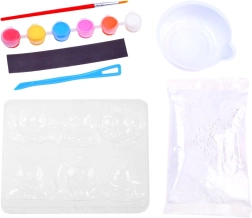 Zestaw zawiera formę, gips, farby, pędzelek, kubeczek do mieszania, szpatułkę oraz taśmę magnetyczną – wystarczy dodać wodę i można zaczynać.
