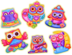 Stwórz do 6 różnych magnesów i ozdób lodówkę lub kącik dziecięcy wesołymi sówkami w radosnych kolorach.