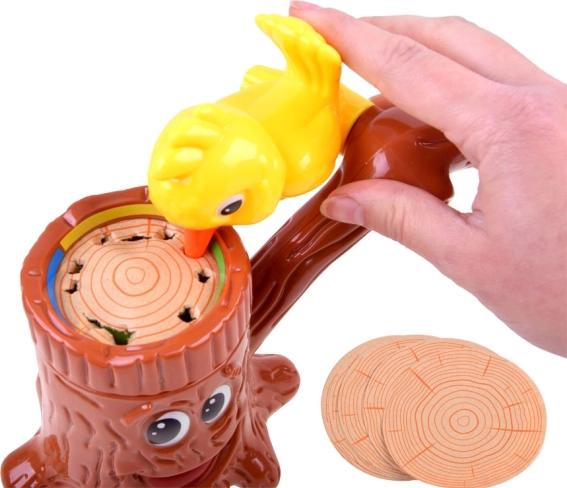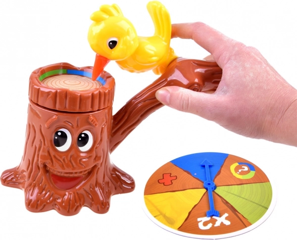Uśmiechnięty pień, żółty ptaszek i obrotowa ruletka od razu przyciągają uwagę dzieci i zachęcają do wielokrotnej gry.