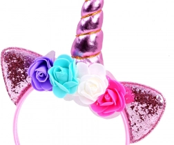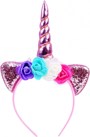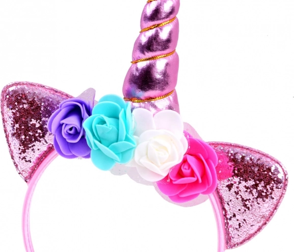 Miękki piankowy róg, połyskujące uszka i barwne kwiaty tworzą wyjątkowy jednorożcowy wygląd na każdą imprezę.