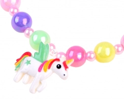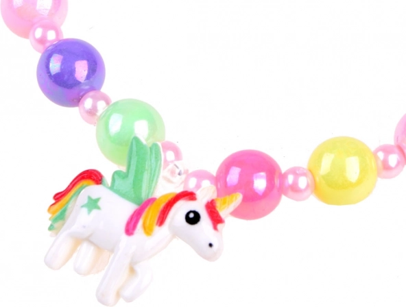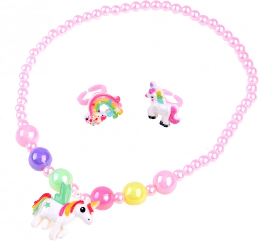 Kolorowy koralikowy naszyjnik z zawieszką jednorożca oraz dwa pierścionki dopełnią kostium i wesprą magiczną zabawę.