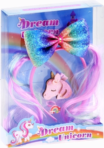 Stylowy i kolorowy zestaw akcesoriów do włosów wyczaruje bajkowy look w kilka chwil. Opaska z miękkim satynowym wykończeniem jest wygodna w noszeniu, a zdobi ją wyrazista błyszcząca kokarda w kolorach tęczy z motywem kucyków. Zestaw uzupełnia błyszcząca spinka z jednorożcem oraz uroczy plastikowy pierścionek z tęczą, które dodają stylizacji figlarnego akcentu.