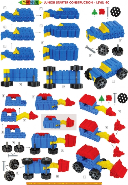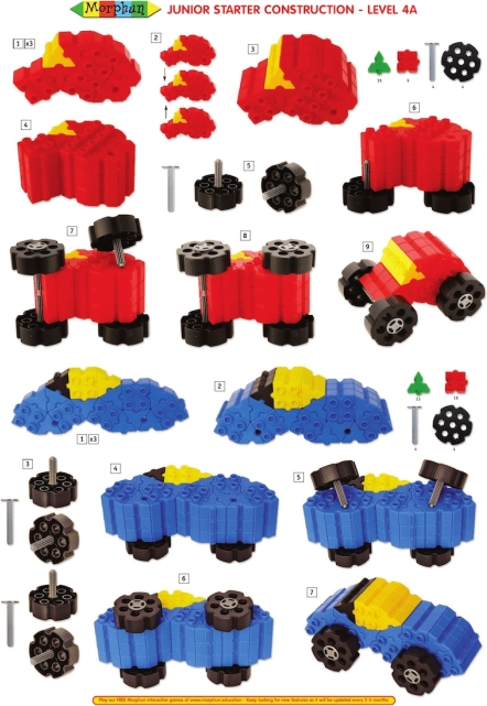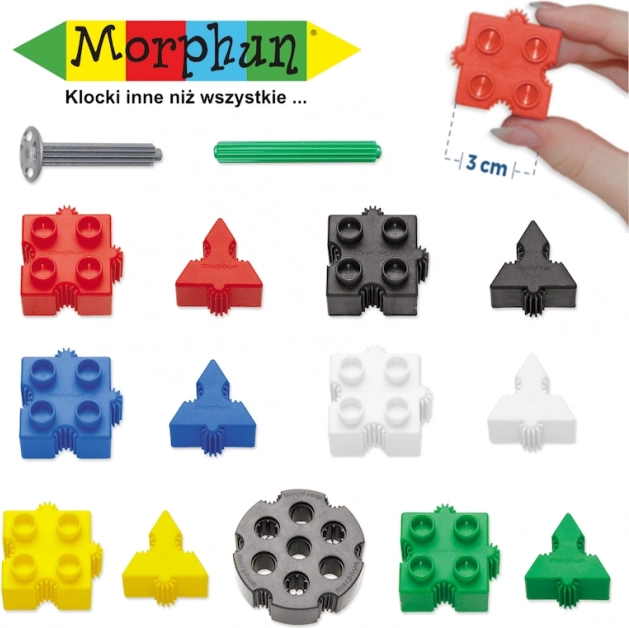 Zestaw Morphun Starter łączy cechy klasycznych klocków i puzzli – elementy można układać jeden na drugim i łączyć bokami. Bogata paleta kolorów i kształtów wspiera naturalną ciekawość i rozwój dzieci. W komplecie są koła do budowy jeżdżących modeli oraz czytelne instrukcje krok po kroku, w tym szablony w skali 1:1 dla łatwych początków.