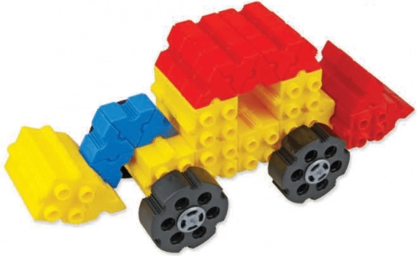 W zestawie znajdują się koła i elementy łączące, dzięki którym powstają jeżdżące pojazdy i inne funkcjonalne konstrukcje rozwijające wyobraźnię i motorykę.
