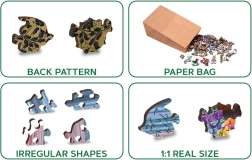 W zestawie znajduje się oddzielna plansza-podkład, która ułatwia układanie, a całość umieszczona jest w ekologicznym papierowym pudełku. Puzzle wykonane są z wytrzymałej płyty pilśniowej HDF o grubości 3–4 mm.