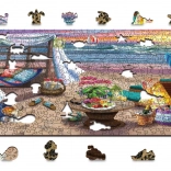 Puzzle składają się ze specjalnie wyciętych elementów, które przedstawiają zwierzęta, budynki i przedmioty, co dodaje kolejny poziom zabawy.