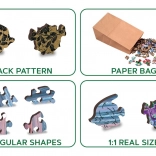 Puzzle zapakowane są w papierowy woreczek i pudełko, całkowicie bez użycia plastiku, co jest przyjazne dla środowiska.