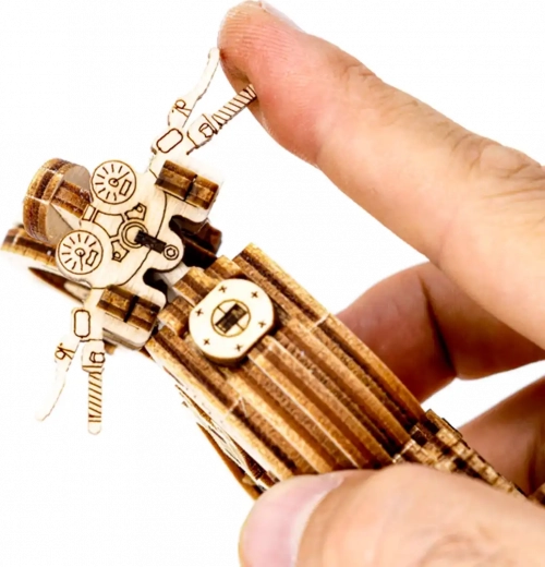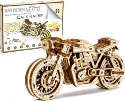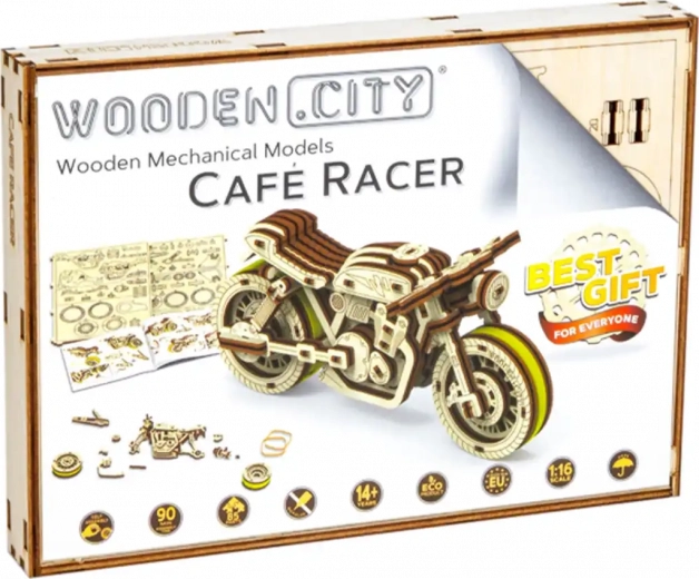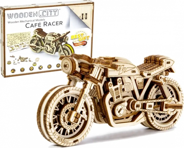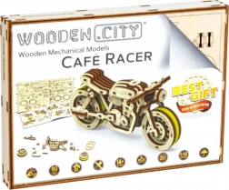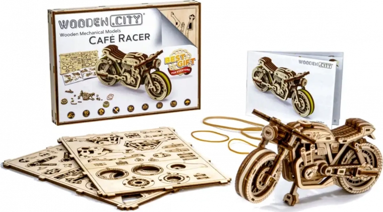 Motocykl Café Racer od WOODEN CITY to szczegółowo dopracowany drewniany model w skali 1:16, który ożywi Twoje biurko lub gablotę. Dzięki gumkowemu silnikowi i mechanizmowi cofania model porusza się do przodu i do tyłu, osiąga zasięg około 1 metra i pozwala podziwiać prawdziwą mechanikę przekładni.