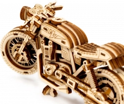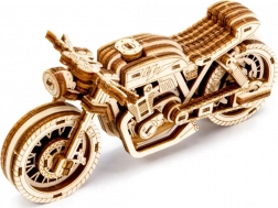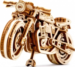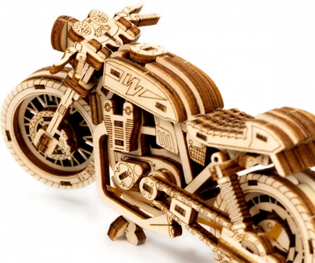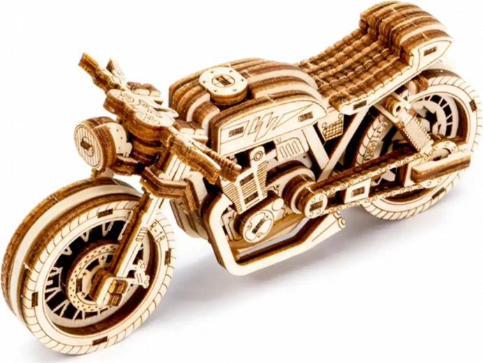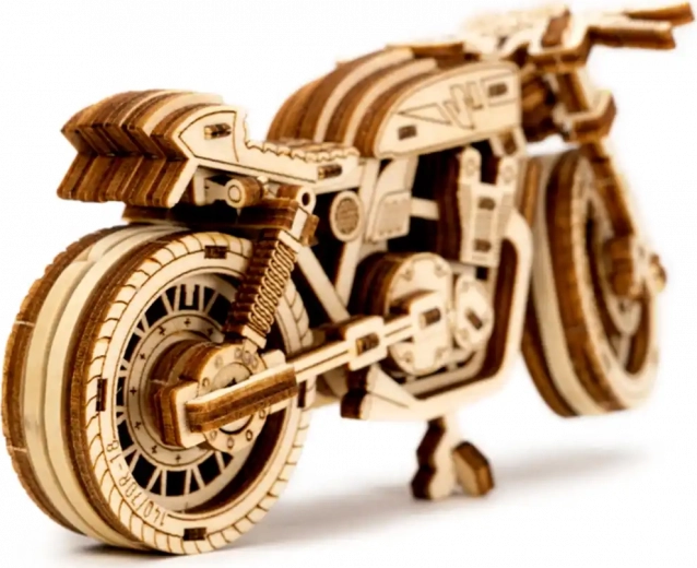 Złóż stylowy motocykl Café Racer z naturalnej sklejki i ciesz się jego funkcyjną mechaniką. Model dzięki mechanizmowi cofania i silnikowi gumkowemu pojedzie aż na 1 metr, ma gumowane koła, mechanizm bezwładnościowy oraz realistyczne elementy sterujące. Składanie odbywa się bez kleju i narzędzi, a opakowanie posłuży jako stojak.