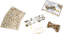 Laserowo wycinane elementy z brzozowej sklejki precyzyjnie do siebie pasują. Aby zapewnić płynną pracę, wystarczy nawoskować osie i koła zębate zgodnie z instrukcją.