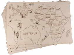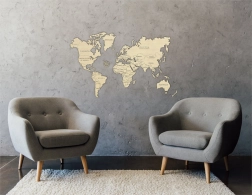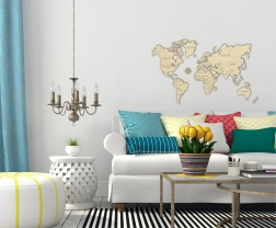 Mapa jest wycinana z brzozowej sklejki, która dodaje wnętrzu naturalny i elegancki wygląd.