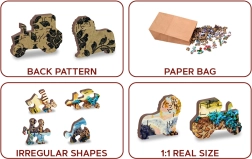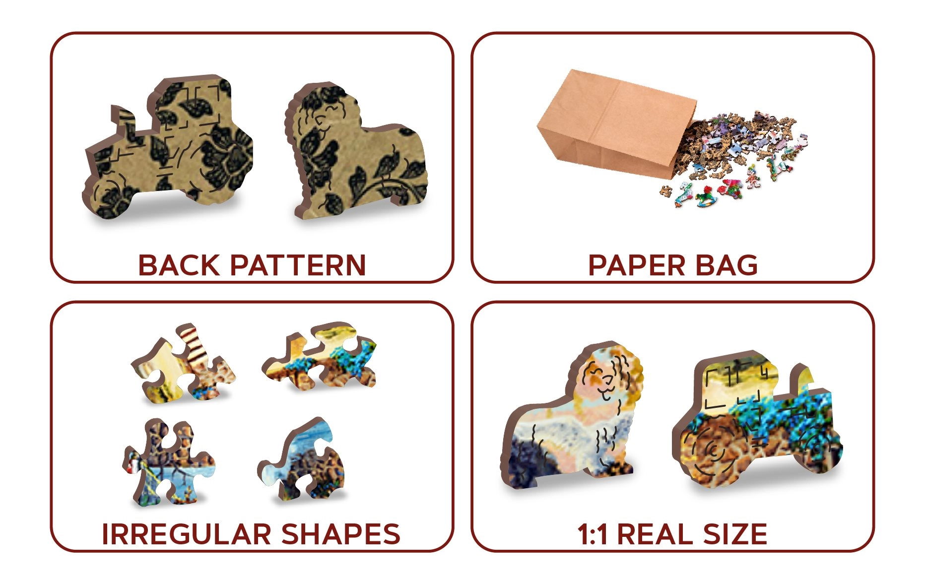 Układanie puzzli z elementami o różnorodnych kształtach jest trudniejsze i stanowi większe wyzwanie niż układanie klasycznych puzzli. Puzzle są dodatkowo dwustronne – można układać według obrazka (strona licowa) lub według kształtu (strona spodnia z wzorem). Marka WOODEN CITY oprócz unikalnej koncepcji puzzli nie zapomina o ekologii, dlatego w tych produktach nie znajdziesz żadnych plastikowych opakowań. Z unikalnie ukształtowanymi elementami przedstawiającymi znane budowle, przedmioty lub zwierzęta zgodnie z tematem motywu. Wyższy poziom trudności przy mniejszej liczbie elementów – układanie puzzli z różnokształtnymi elementami jest bardziej wymagające.