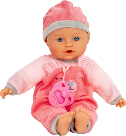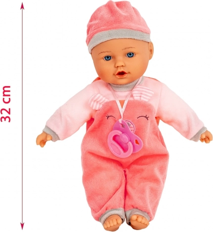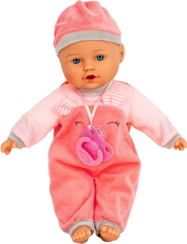 Lalka Julka wygląda jak słodkie niemowlę z niebieskimi oczami. Ma gumową główkę, rączki i nóżki, miękkie tekstylne ciałko i nosi różowy strój ze smoczkiem. Dzięki przyjemnym materiałom i starannemu wykonaniu jest idealna do codziennej zabawy i tulenia.