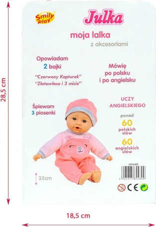 Julka mówi i śpiewa po polsku i angielsku (ponad 60 słów w każdym języku) oraz opowiada dwie ulubione bajki: Czerwony Kapturek i Złotowłosa i trzy niedźwiedzie. Zabawa lalką wspiera małą motorykę, kreatywną zabawę oraz odpowiedzialność podczas opieki nad bobasem.