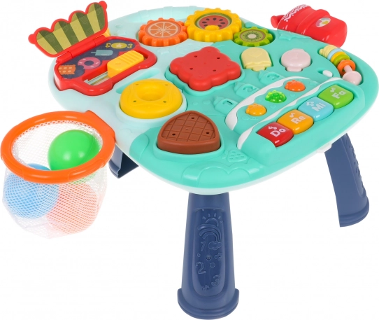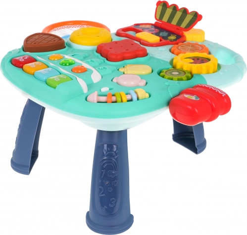 Zawiera przyciski muzyczne i inne interaktywne elementy wspierające rozwój sensoryczny.