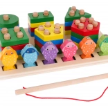 Zestaw 2 w 1, drewniane puzzle i łowienie rybek przeznaczony jest dla dzieci od 3 lat. Zestaw składa się z drewnianej podstawy z kołkami i prostokątnymi wgłębieniami. Na kołkach układa się kolorowe klocki z zaokrąglonymi końcami i w różnych kształtach, a do wgłębień wkłada się rybki. Rozmieszczone są różne kolorowe figury geometryczne, na przykład koło, prostokąt, trójkąt, kwadrat, pięciokąt i sześciokąt. Koło ma jeden otwór, prostokąt dwa, trójkąt trzy, kwadrat cztery, pięciokąt pięć, a sześciokąt sześć. Zadaniem malucha jest sprytnie dopasować odpowiednią figurę do podanej liczby kołków. Dodatkowo na planszy znajduje się gra w łowienie rybek. Gra polega na umieszczaniu rybek z magnesami w prostokątnych otworach za pomocą magnetycznej wędki. Zestaw jest idealny do rozwijania sprawności manualnej, ćwiczy koordynację motoryczną, dotykową i wzrokową dziecka. Dziecko rozwija wyobraźnię i pobudza kreatywność. |