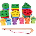 - drewniana podstawka z kołkami i wgłębieniami, - 4 kółka, .- 4 prostokąty, .- 4 trójkąty, .- 4 kwadraty, .- 4 pięciokąty, .- 4 sześciokąty, .- 6 rybek, .- wędka magnetyczna. . |