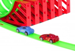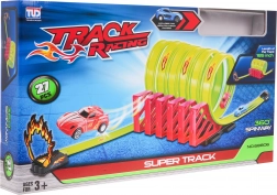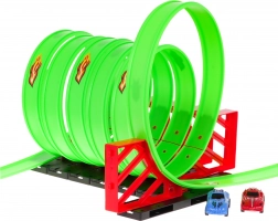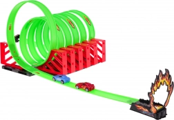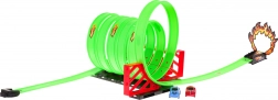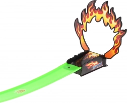 Ten kolorowy tor wyścigowy o całkowitej długości do 185 cm dostarcza solidnej dawki adrenaliny. Autko rusza po prostej, pokonuje 6 płynnych pętli, a na końcu przelatuje przez „ogniste” koło. Dzięki napędowi pull-back nie potrzebujesz baterii – wystarczy delikatnie pociągnąć autko do tyłu i puścić.