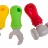 W zestawie znajdują się śruby, gwoździe oraz dziecięce narzędzia: śrubokręt, klucz francuski i młotek do bezpiecznego wkręcania i wbijania.