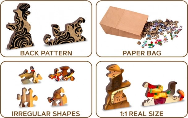 Układanie puzzli z elementami o różnorodnych kształtach jest trudniejsze i stanowi większe wyzwanie niż układanie klasycznych puzzli. Puzzle są dodatkowo dwustronne – możesz układać według obrazka (strona licowa) lub według kształtu (strona spodnia z wzorem). Marka WOODEN CITY oprócz unikalnej koncepcji puzzli nie zapomina o ekologii, dlatego w tych produktach nie znajdziesz żadnych plastikowych opakowań. Z unikalnie wycinanymi elementami przedstawiającymi znane budowle, przedmioty lub zwierzęta zgodnie z motywem. Wyższy poziom trudności przy mniejszej liczbie elementów – układanie puzzli z różnokształtnymi elementami jest bardziej wymagające.