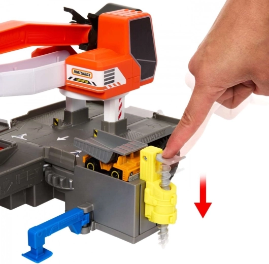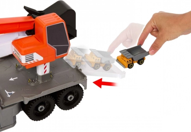 Ciężarówka z koparką Matchbox oferuje funkcje takie jak wiertło i ruchomy żuraw dla realistycznej zabawy.
