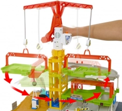 Dołączony żuraw (50,5 cm) z jednym z trzech akcesoriów - skrzynką, platformą lub przenośną 'toaletą' - pozwala przenosić je po placu budowy. Zawiera również koparkę Matchbox 1:64, którą możesz sterować po całym placu budowy. Kolory i dekoracje mogą się różnić.