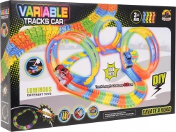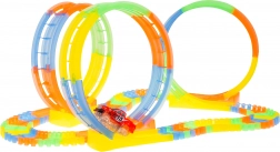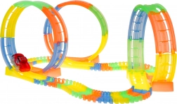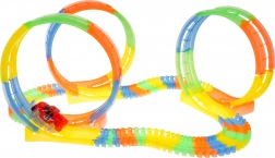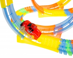 Świecący w ciemności tor z 3 pętlami i autkiem, które jest częścią zestawu, jest odpowiedni dla dzieci od 3 lat. Zestaw składa się ze 148 elementów. Znajdziesz tu proste odcinki oraz pętle, na których autko obraca się o 360 stopni. Tory są fluorescencyjne i świecą w ciemności. Pojazd będący częścią zestawu ma podświetlenie LED, a jazda w ciemności tworzy niesamowity efekt. Pojazd jest zasilany 2 bateriami AA (brak w zestawie). Aby uruchomić auto, wystarczy nacisnąć przycisk na jego dachu. Całkowita długość toru to aż 468 cm. A więc start! |