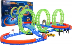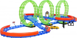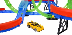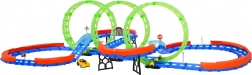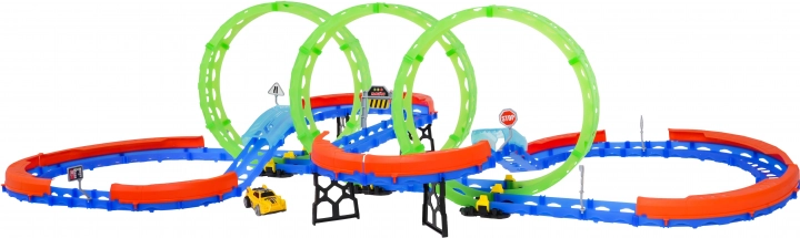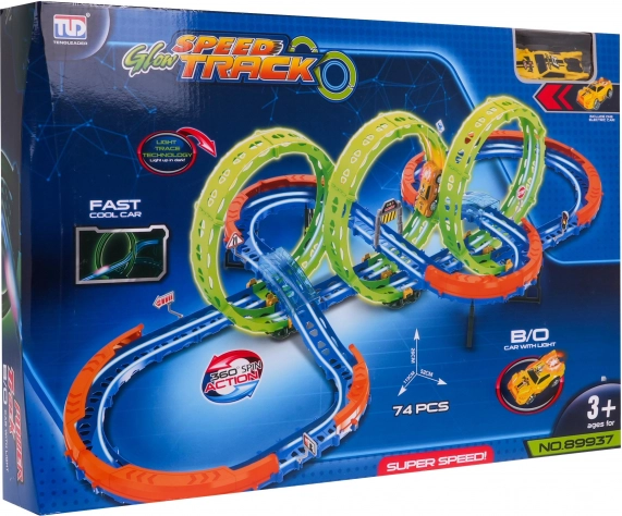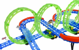 Zbuduj własny tor wyścigowy z trzema dużymi pętlami i ciesz się emocjonującą jazdą z samochodzikiem LED. Dzięki fluorescencyjnym elementom tor świeci w ciemności, więc wyścigi świetnie wyglądają także wieczorem. Stabilna konstrukcja, ochronne barierki i zróżnicowane odcinki gwarantują płynny przejazd nawet przy dużej prędkości.
