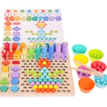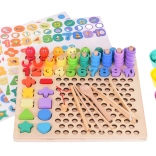 - drewniana podstawa i nadstawka z otworami, 3 dwustronne karty wzorów, 7 kubeczków, pęseta, wędka, łyżeczka, 2 patyczki, 8 magnetycznych rybek, 5 znaków matematycznych, cyfry 1–10, 5 kształtów (kwadrat, trójkąt, koło, gwiazda, serce), 55 krążków, 77 koralików