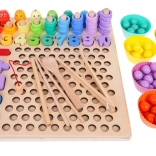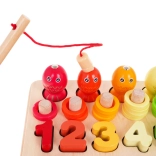 Ten kolorowy drewniany zestaw edukacyjny oferuje dzieciom dziesiątki możliwości zabawy: łowienie rybek magnetyczną wędką, nawlekanie i liczenie krążków na słupki, dopasowywanie cyfr 1–10, układanie prostych równań oraz rozpoznawanie kształtów i kolorów. Silikonowe kubeczki i drewniane koraliki z pęsetą, łyżeczką i patyczkami doskonale rozwijają chwyt i precyzję.
