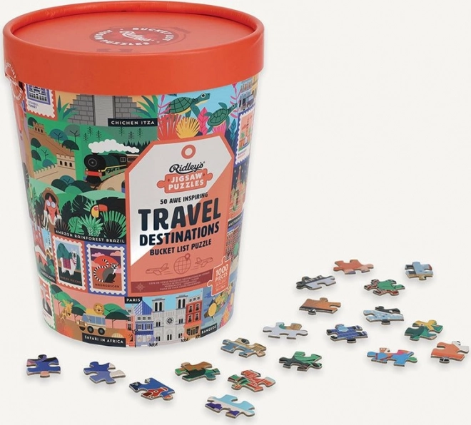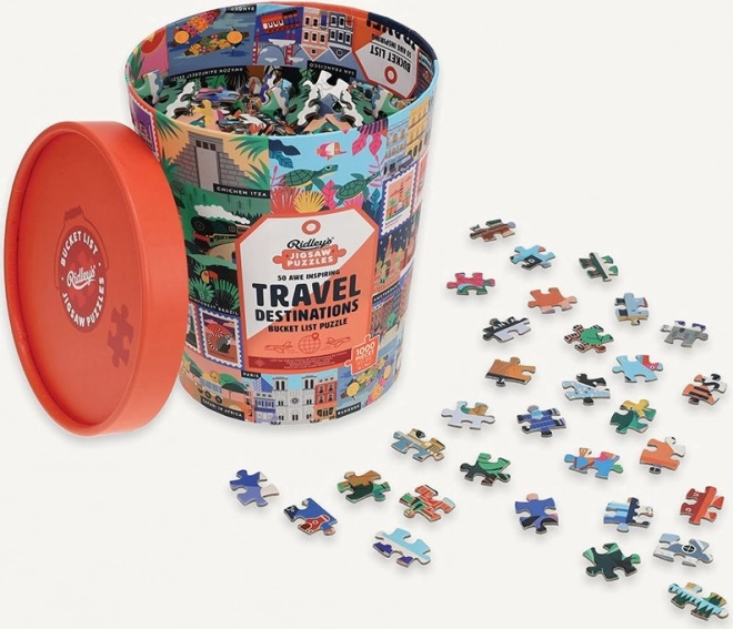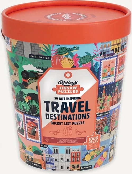 Odkryj świat z wygody własnego domu dzięki wyjątkowym puzzlom RIDLEY'S GAMES, które przedstawiają 50 ikonicznych miejsc turystycznych z całego świata. Stylowe opakowanie w kształcie wiaderka, 1000 elementów dla przyjemnego wyzwania oraz dołączona plansza wzorcowa. Idealny prezent dla miłośników podróży i stylowych dodatków.