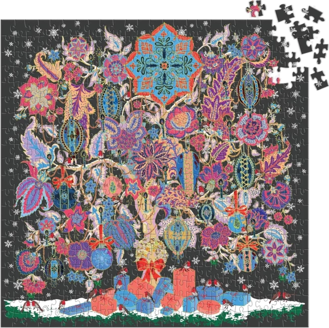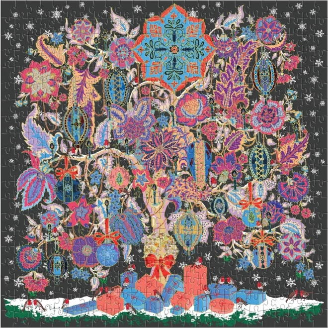 Kwadratowe puzzle Liberty: Bożonarodzeniowe drzewo życia, 500 elementów z metalicznymi refleksami. Wymiary po ułożeniu ok. 51 × 51 cm. W zestawie plansza z podglądem.