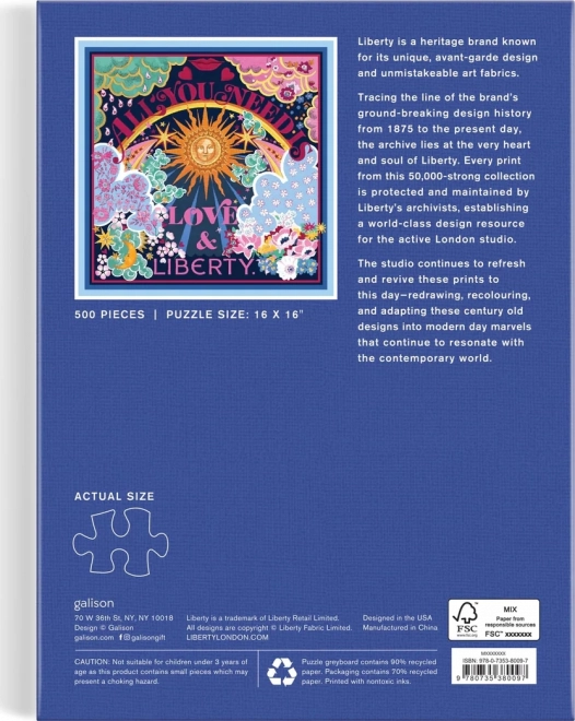 Nasze Liberty Puzzle Kwadratowe oferuje unikalne połączenie sztuki i relaksu. Z motywem 'Wszystko, czego potrzebujesz, to miłość' zanurzasz się w świecie, gdzie miłość i wolność są głównymi tematami. Opakowanie zaprojektowane w kształcie książki sprawia, że jest to nie tylko puzzle, ale także stylowy dodatek do Twojego domu.