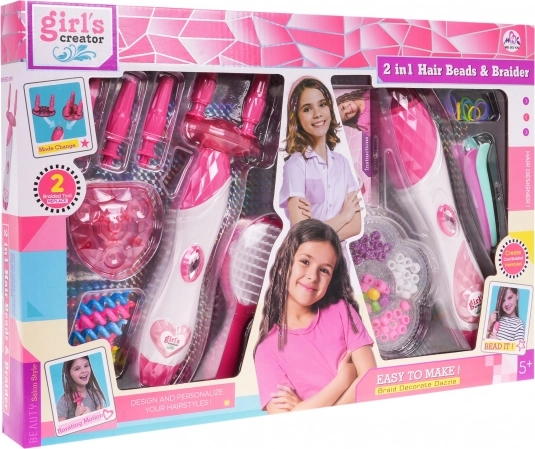 - maszynka do zaplatania włosów ok. 26,5 cm x 7,5 cm x 7,5 cm, - aplikator koralików do włosów ok. 26 cm x 5,5 cm x 5 cm, - pudełko na koraliki ok. 11 cm x 11 cm x 2 cm, - koralik ok. 0,5 cm x 0,8 cm, - szczotka do włosów ok. 14,5 cm x 6 cm x 2,5 cm, - sprężynka do włosów ok. 4,5 cm x 1 cm, - gumka do włosów ok. 9,5 cm x 1,3 cm x 2 cm, - opakowanie ok. 44,5 cm x 30,8 cm x 5 cm, |