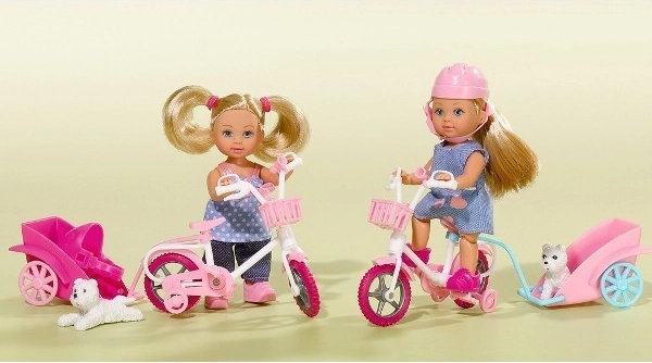 - Lalka Evi, trójkołowy rowerek z odczepianą przyczepką, piesek, kask