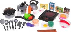 Ten wspaniały zestaw kuchenny zawiera wszystko, czego mały kucharz może potrzebować. Kuchenka indukcyjna, zasilana trzema bateriami AA, umożliwia realistyczne dźwięki smażenia i gotowania, a bezpieczne plastikowe elementy, takie jak garnki, patelnie i inne akcesoria, są idealne do dziecięcej zabawy, bez ostrych krawędzi i ryzyka zranienia. Zestaw zawiera różne atrapy produktów spożywczych, w tym jaja, ryby i warzywa, co zwiększa autentyczność zabawy.