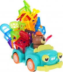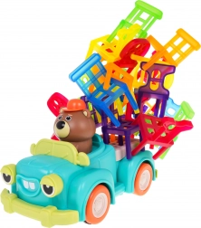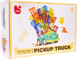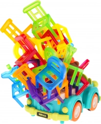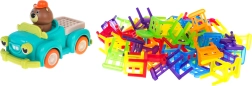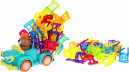 Gra umiejętności Składanie krzesła i samochodu jest idealna dla dzieci od 3 lat. Składa się z 48 kolorowych krzesełek o różnych kształtach i samochodu, który jeździ po okręgu. Twoim zadaniem jest zbudowanie wieży z krzeseł na ruchomym samochodziku. To zadanie poprawia koordynację ręka-oko i zwiększa precyzję. Samochodzik może zmieniać średnicę obrotu między 40 cm a 120 cm za pomocą kółka w dolnej części pojazdu.