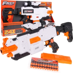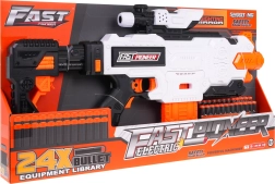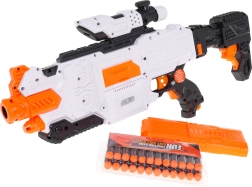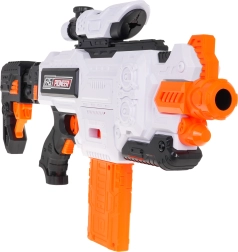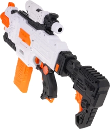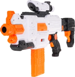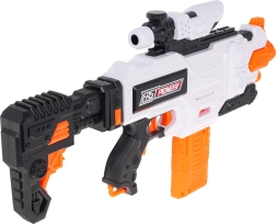 Ta zabawka o futurystycznym wyglądzie dostarcza realistycznych doświadczeń podczas gry z dodatkowymi celownikami i rozszerzonymi kolbami.