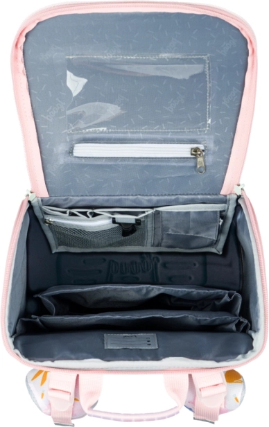 Odchylany system otwierania, wewnętrzny organizer z gumką, przezroczysta kieszeń na plan lekcji oraz izolowana przednia kieszeń na śniadanie lub drobiazgi.