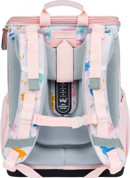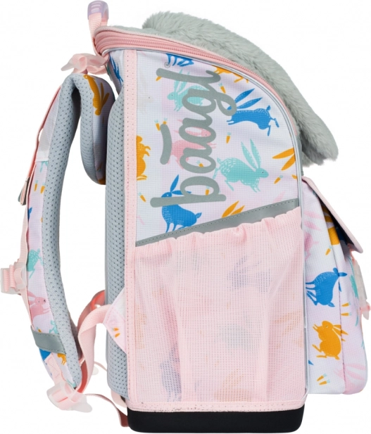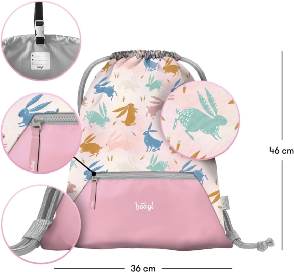 Zestaw BAAGL Zippy Bunny łączy zabawny design z dbałością o zdrowe noszenie i porządek. Tornister z przesuwnym systemem ERGO ADJUSTABLE SYSTEM dopasowuje się do wzrostu dziecka, posiada usztywnione, ergonomicznie wyprofilowane plecy, w pełni regulowane paski oraz stabilną, lekką konstrukcję. Nowy odchylany system otwierania ułatwia dostęp do podręczników prosto z ławki.