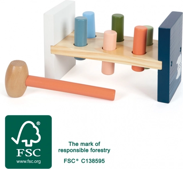 Ta wysokiej jakości wbijanka z drewna FSC® 100% jest idealna do pierwszych umiejętności małych konstruktorów. Dzieci drewnianym młoteczkiem wbijają kolorowe walce w ławkę, a po zakończeniu łatwo wznawiają zabawę prostym odwróceniem. Boczne nadruki z niedźwiedziem polarnym są czytelne również podczas zabawy do góry nogami.