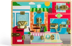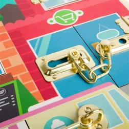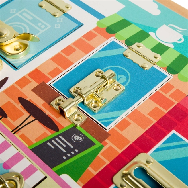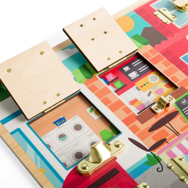 Ta wysokiej jakości drewniana tablica manipulacyjna w stylu Montessori zapewnia dzieciom bezpieczną przestrzeń do ćwiczenia chwytu, cierpliwości i rozwiązywania problemów. Za każdy mi drzwiczkami z innym typem zamknięcia kryje się kolorowa scena (pralnia, kuchnia, kawiarnia i inne), która zachęca do odkrywania i wzmacnia wyobraźnię.
