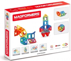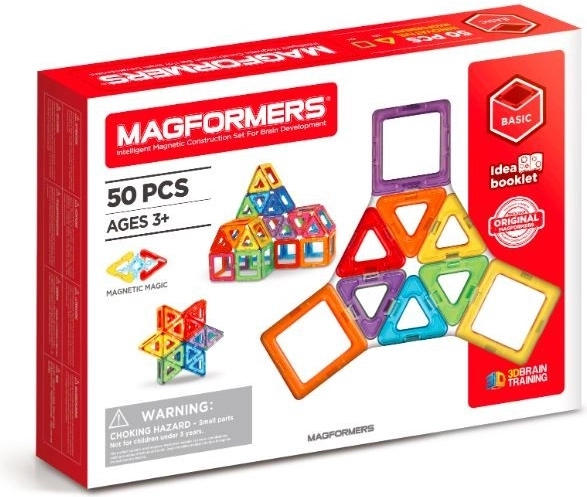 MAGFORMERS SET 50 to klocki z wbudowanymi, silnymi magnesami neodymowymi, które zawsze się wzajemnie przyciągają. Wystarczy zbliżyć do siebie ścianki dwóch klocków, a natychmiast się połączą. Dzięki klockom uformowanym w kształty geometryczne możesz budować wspaniałe trójwymiarowe konstrukcje. Do zabawy możesz użyć dołączonej instrukcji, kolejnych przykładów na stronach magformersworld.com lub własnej wyobraźni. Zestaw zawiera: 26 trójkątów i 24 kwadraty.